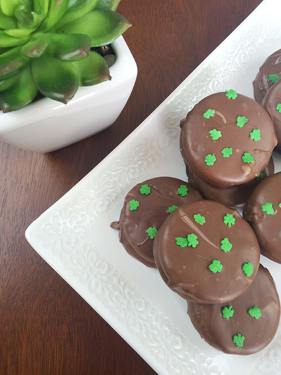 Surprisingly, making these chocolate covered mint Oreos went smoothly! I melted a bar of baking chocolate, submerged each Oreo, place them to dry on parchment paper and added a few shamrock sprinkles.