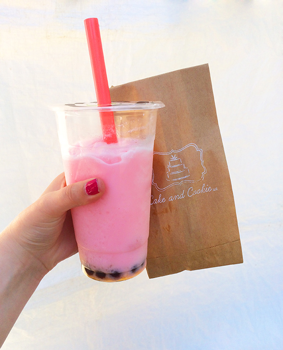 {Stocking up on bubble tea and rose macarons at the farmers market}