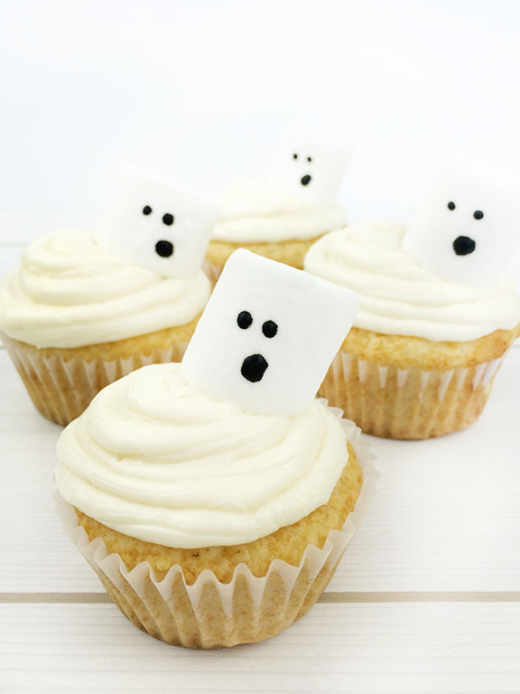 To those who know me well, this is not a huge surprise. I even have to close my eyes during horror film trailers! Being scared is just not my cup of tea. Therefore, these “spooky” ghost cupcakes were right up my alley. They are a light-hearted way to enjoy Halloween and they only take a few steps to recreate.