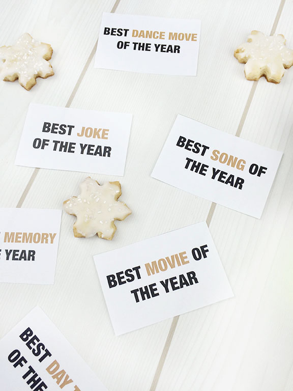 These “Best of 2015” Cards are a fun way to reminisce about the year and discuss your favorite memories and debate pop culture events. Grab your free download here and print out a set of cards for each guest. Instruct your guests to write their answers on the back of the cards and place in a container. Set time aside during the night to go through all the votes and have fun looking back on 2015.
