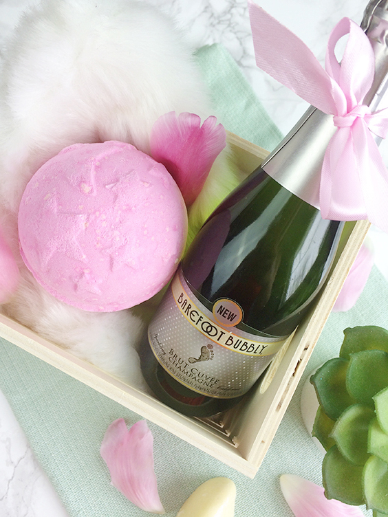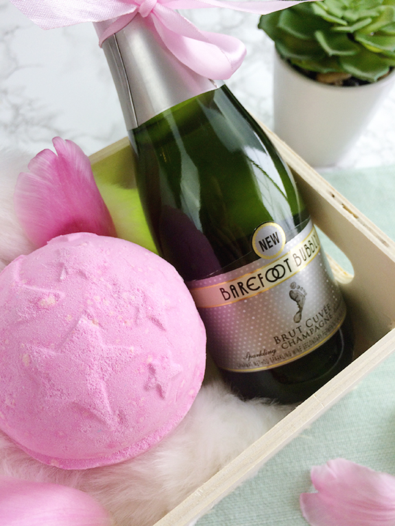 To give the gift of “relaxation,” I added little items that facilitate an evening of pampering: a Lush bath bomb, massage bar, and mini bottle of champagne. Search Spotify for a spa playlist and you have the perfect environment to let your stress melt away.