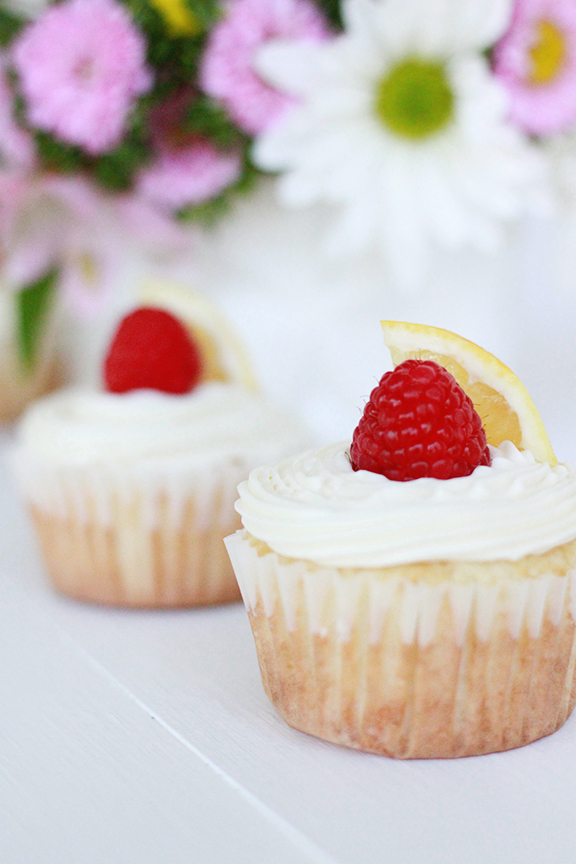 - Pipe onto each cupcake and top with a fresh raspberry and lemon wedge