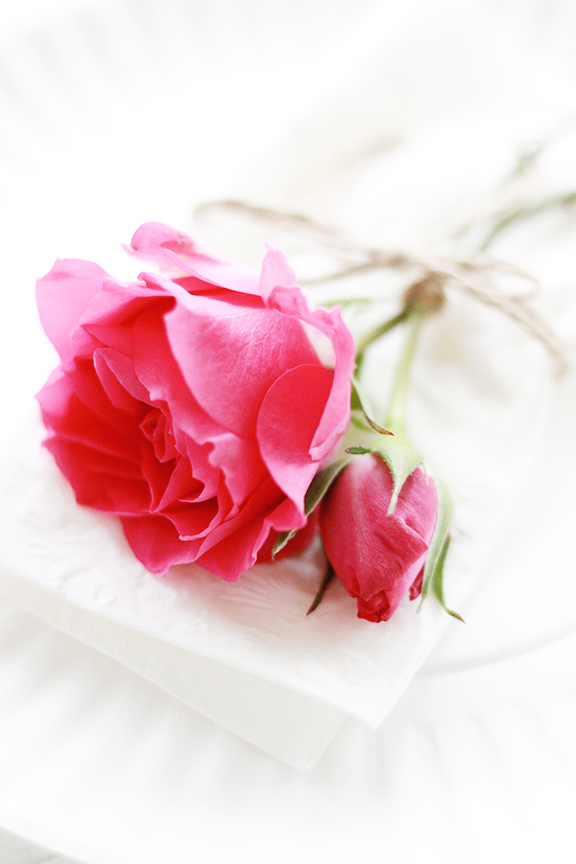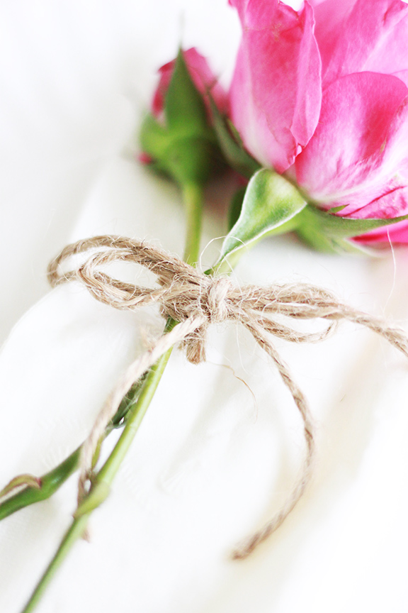 To spice up our patio table settings, I decided to incorporate fresh blooms. By clipping off a single rose stem and tying it around a folded paper napkin with twine, I was able to add a rustic pop of color to the table. Perfect place setting for a relaxed Labor Day weekend BBQ party!