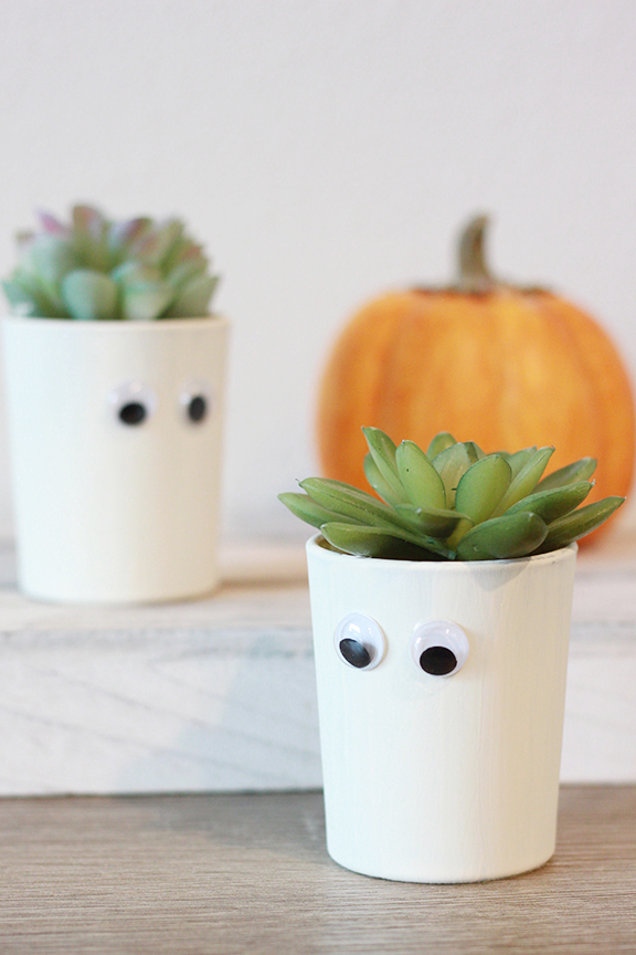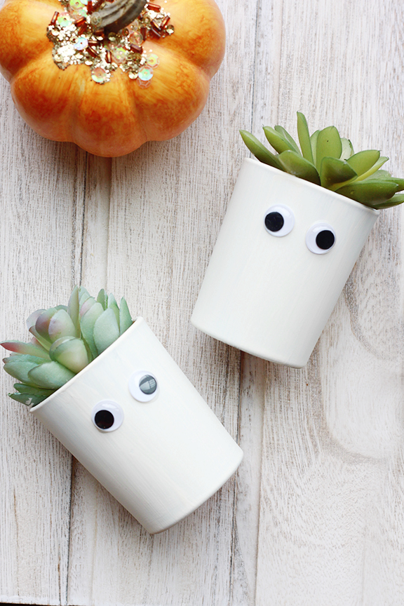 Everytime I glance at one of these planters I catch myself smiling. That’s the whole point of holiday décor, right?! To bring joy into your home. Therefore, I’m glad I didn’t try to push myself into buying the skulls, bats, or creepy severed hand candy bowls that line the shopping aisles. Instead, I will enjoy my mini glitter pumpkins and googly-eyed planters. To learn how to make these planters at home, follow the instructions below!