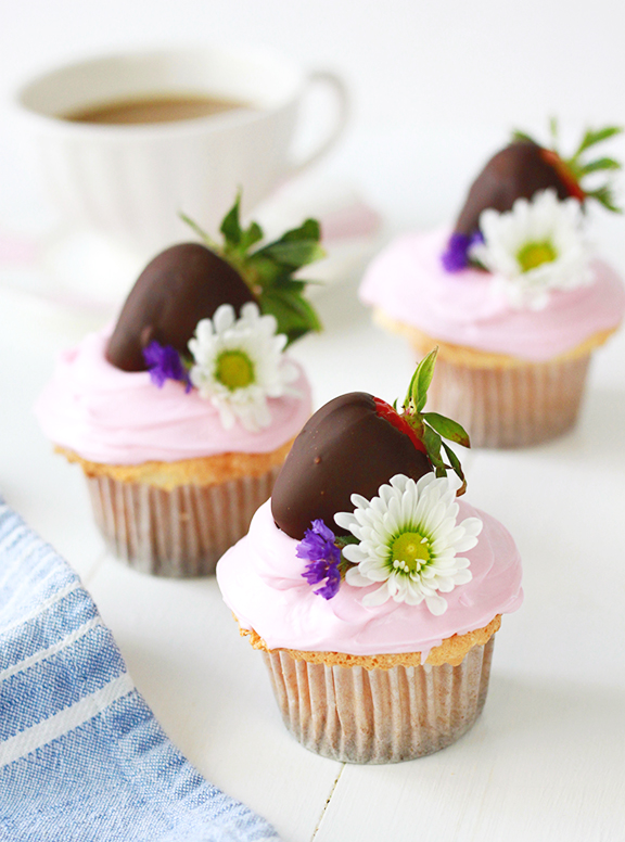 To celebrate where I am in life now, I decided to treat myself to two of my favorite desserts – chocolate covered strawberries and angel food cake. I had never tried making angel food cupcakes before and was worried on how they would fare without being cooled upside down, but I was surprised on how well they turned out! Topped with a chocolate covered strawberry and a few fresh blooms, these cupcakes were the perfect birthday treat.