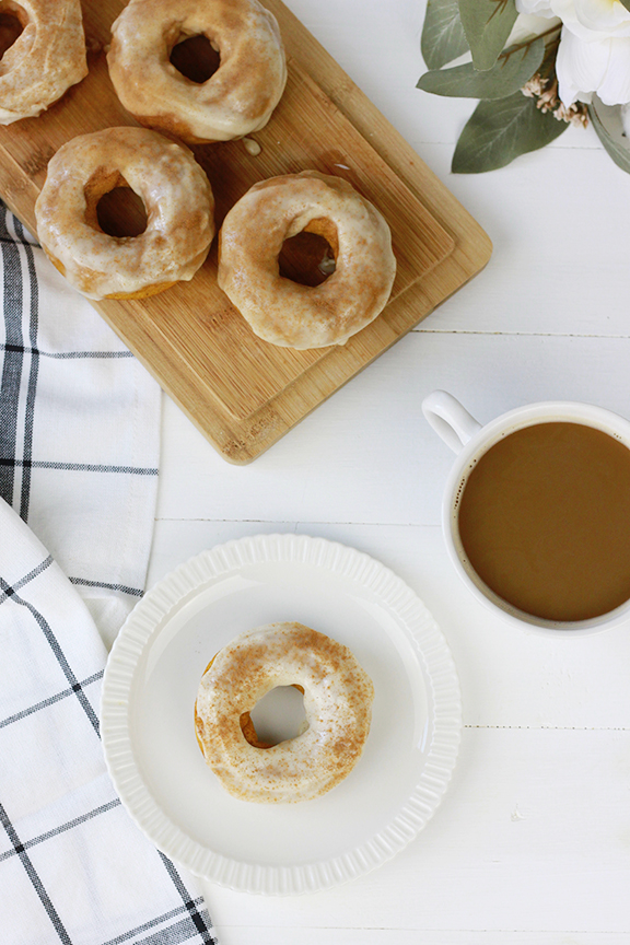 Back to more important things – pumpkin spice. Now that we have reached the middle of September, I’m on board with adding a few fall touches around the home and pulling out my fall spice blends. Bring on nutmeg, clove, and cinnamon! There is something about a slight chill in the air to make me want to curl up in a blanket, drink hot apple cider, and indulge in a sweet treat. This time around, I treated us to a batch of baked pumpkin spice donuts with maple glaze.