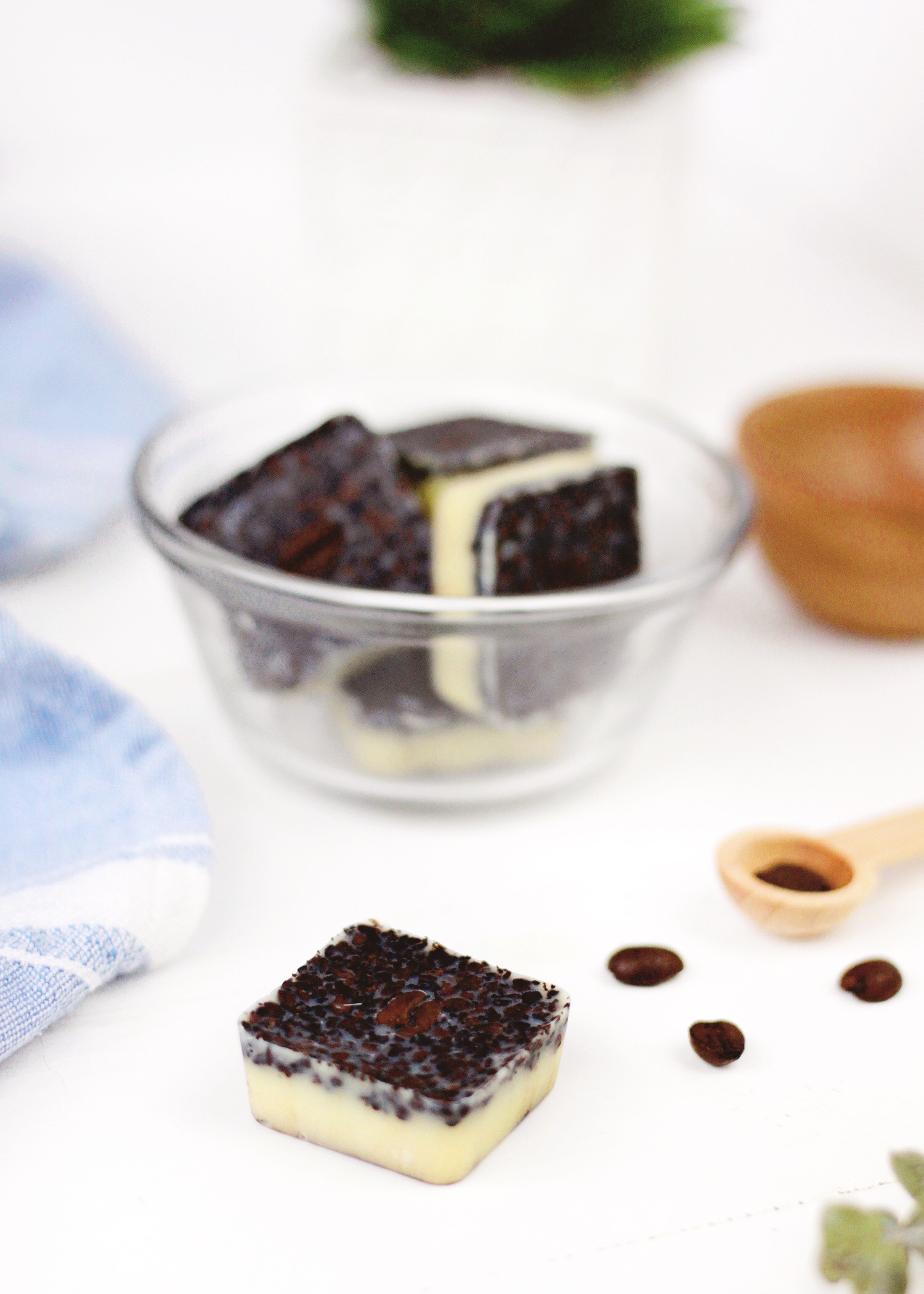 - Fill square silicone molds with 1 tsp of coffee grounds